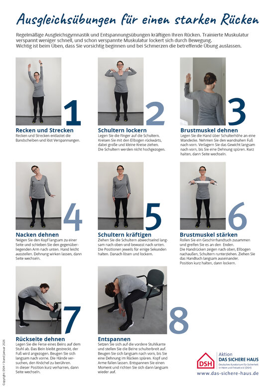 Plakat mit verschiedenen Ausgleichs- und Gymnastikübungen für den Rücken.