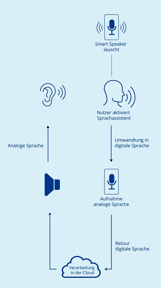 Im allgemeinen Sprachgebrauch werden die Begriffe häufig synonym verwendet. Doch es gibt einen klaren Unterschied: Der Sprachassistent ist eine Software, ein Smart Speaker ist eine Hardware. Es handelt sich dabei um einen intelligenten Lautsprecher mit integriertem Mikrofon, der mit dem Internet verbunden ist. Das bedeutet: In jedem Smart Speaker steckt ein Sprachassistent.