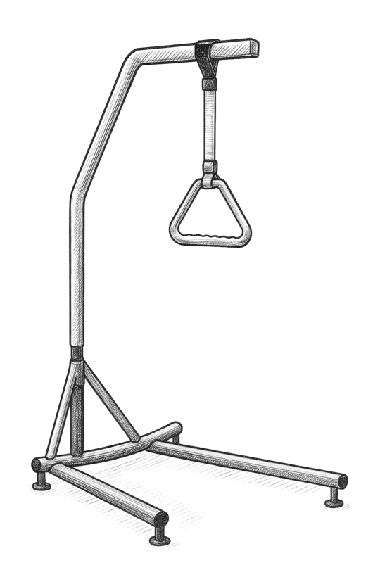Bettgalgen: Ein triangelförmiger Haltegriff ermöglicht das Hochziehen aus der Rückenlage. Aus dieser Sitzposition können Betroffene leichter aufstehen. Der Galgen hängt etwa auf Brusthöhe über dem Bett und ist stabil am Bettrahmen, an der Wand oder an einem freistehenden Gestell befestigt.