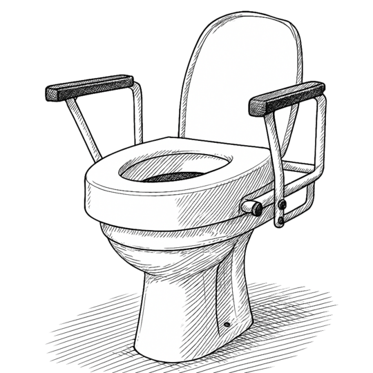 Toilettensitzerhöhung: Eine stabile Sitzerhöhung mit seitlichen Haltegriffen ersetzt die normale Toilettenbrille und erleichtert das Hinsetzen und Aufstehen.